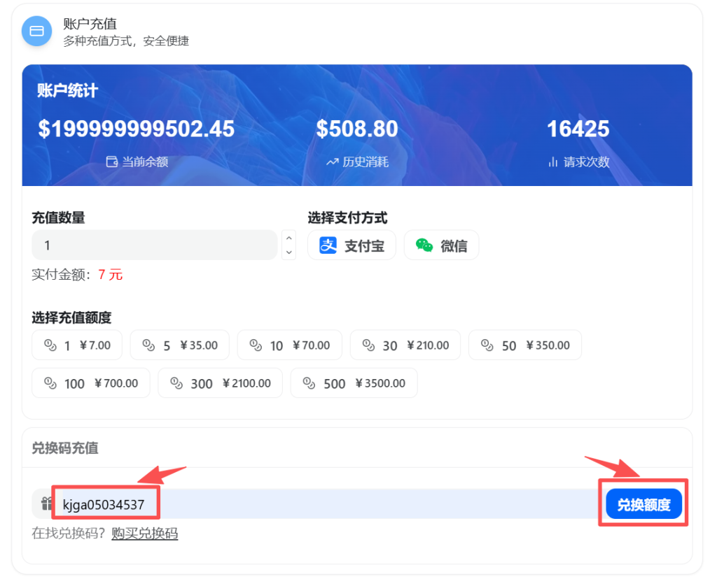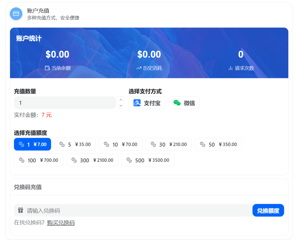 第一种(推荐),直接在线充值,即充值1美金官方额度,按汇率需支付7元人民币即可。若有充值失败的情况,请点击>>魔卡客服,添加微信【mkapikey】进行人工处理。