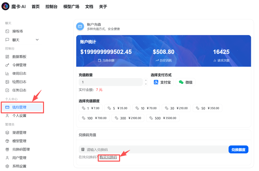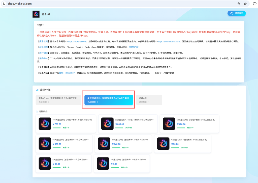 第二种,选择兑换码充值,即点击获取兑换码,页面跳转至魔卡商城(https://shop.moka-ai.com/),找到商品分类中的兑换码,选择你需要的额度下单即可,支付成功后会收到带有兑换码的邮件,将兑换码复制框内点击兑换即可充值到账。