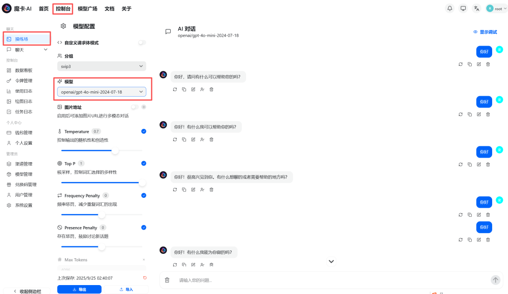 如有需求第一步赶紧点击魔卡个人中心(api.moka-ai.com)注册账号,注册成功即送0.2美金额度免费使用,可以进入控制台中的操练场选择不同的模型进行聊天对话