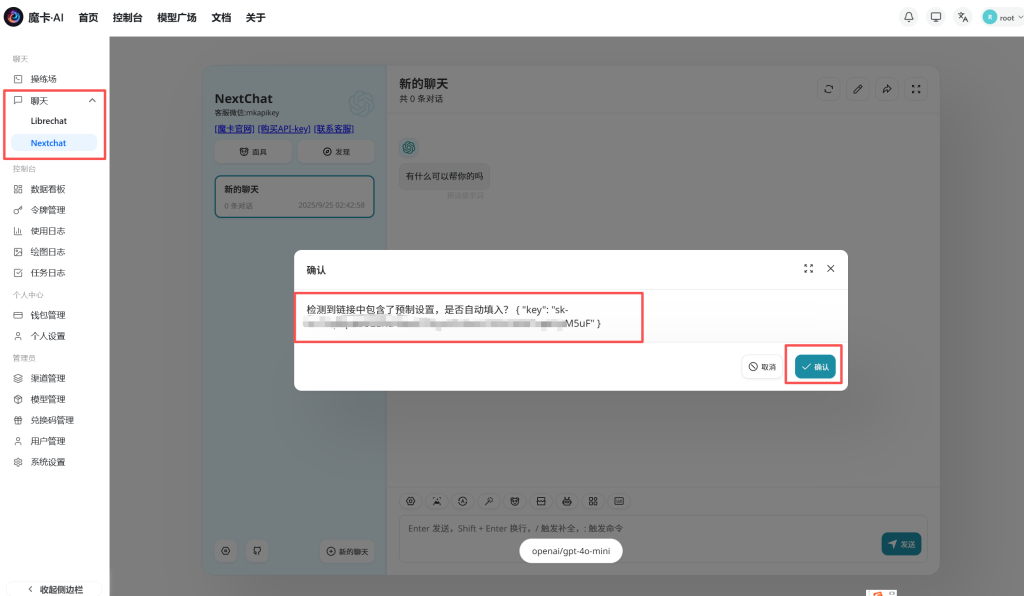 创建添加好API-Key令牌后,可以直接选择控制台的聊天模块中的Nextchat,系统会自动复制填入API-Key,点击确认即可和各类AI大模型聊天对话