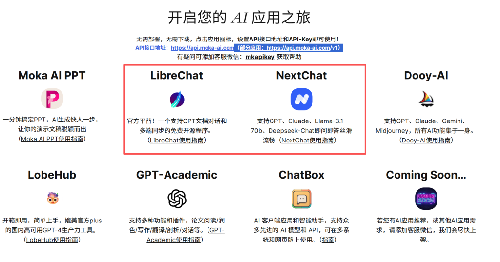 还可以将API-Key令牌复制到魔卡官网(https://moka-ai.com/)中的NextChat、librechat等AI应用直接使用。支持GPT对话问答,生成论文代码,上传图片等等功能。